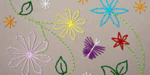 厚紙に下絵を描き、線にそって1cm間隔で目打ちで穴をあけ、針 …